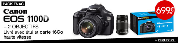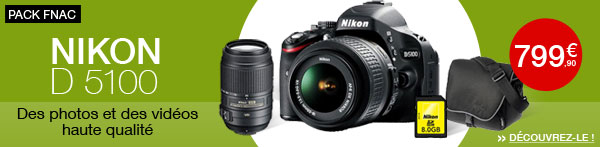 - Pack Fnac : Nikon D5100 + 2 Obj. Nikon AF-S DX VR série G : 18 - 55 mm f/3.5 - 5.6 + 55 - 300 mm f/4.5 - 5.6 + Fourre-tout + Carte SDHC 8 Go