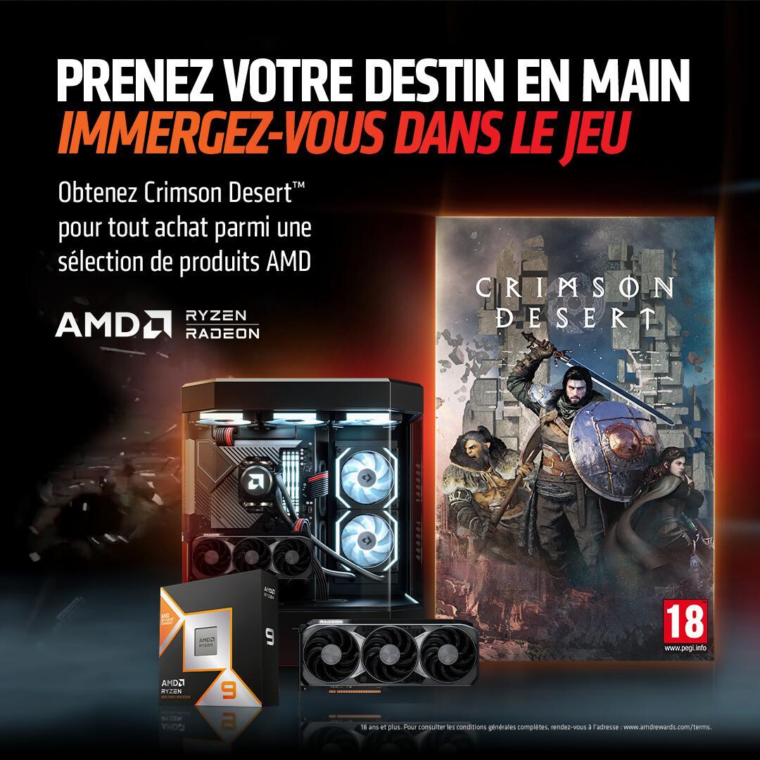 Du 17 février au 25 avril 2026 pour l'achat d'une carte graphique AMD, d'un processeur AMD ou d'un PC équipé AMD éligible, profitez du jeu Crimson Desert offert.
